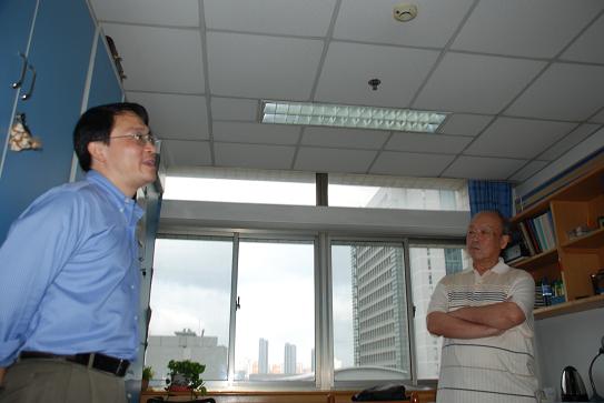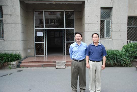 张自力回到中国科技大学北区的教学楼前。这座许多四系校友熟悉的教学楼已成为继续教育学院教学楼,暑期颇为冷清。探望若干房门紧闭的教室后,张自力高兴的在楼前与陈向军教授合影留念。