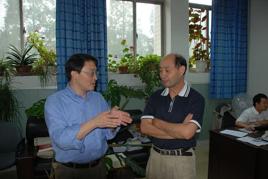 张自力与朱栋培教授交谈。朱栋培上午出席了张自力报告会对其演讲内容颇有兴趣。
